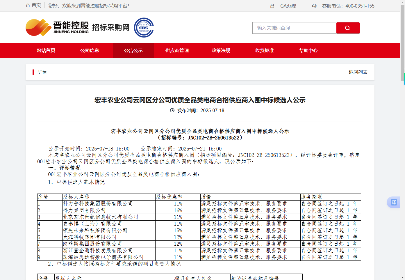 【喜报】恭喜我司入围宏丰农业公司云冈区分公司优质全品类电商项目中标候选人
