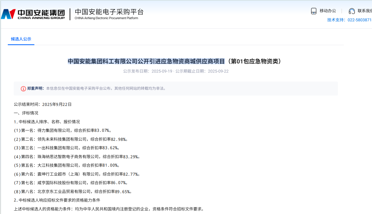 [喜报]热烈祝贺我司中标中国安能集团科⼯有限公司公开引进应急物资商城供应商项⽬