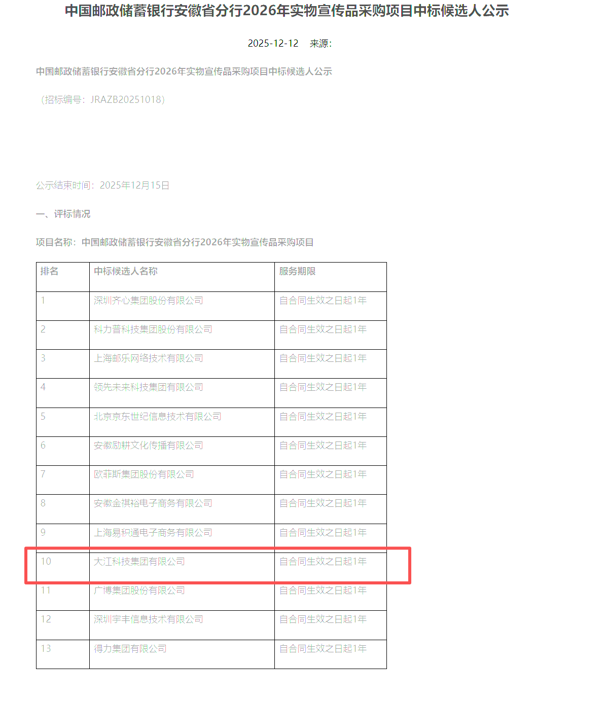 [喜报]热烈祝贺我司成功中标中国邮政储蓄银行安徽省分行2026年实物宣传品采购项目