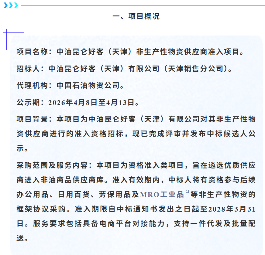 [喜报]热烈祝贺我司成功入选中油昆仑好客(天津)非生产性物资供应商项目候选人